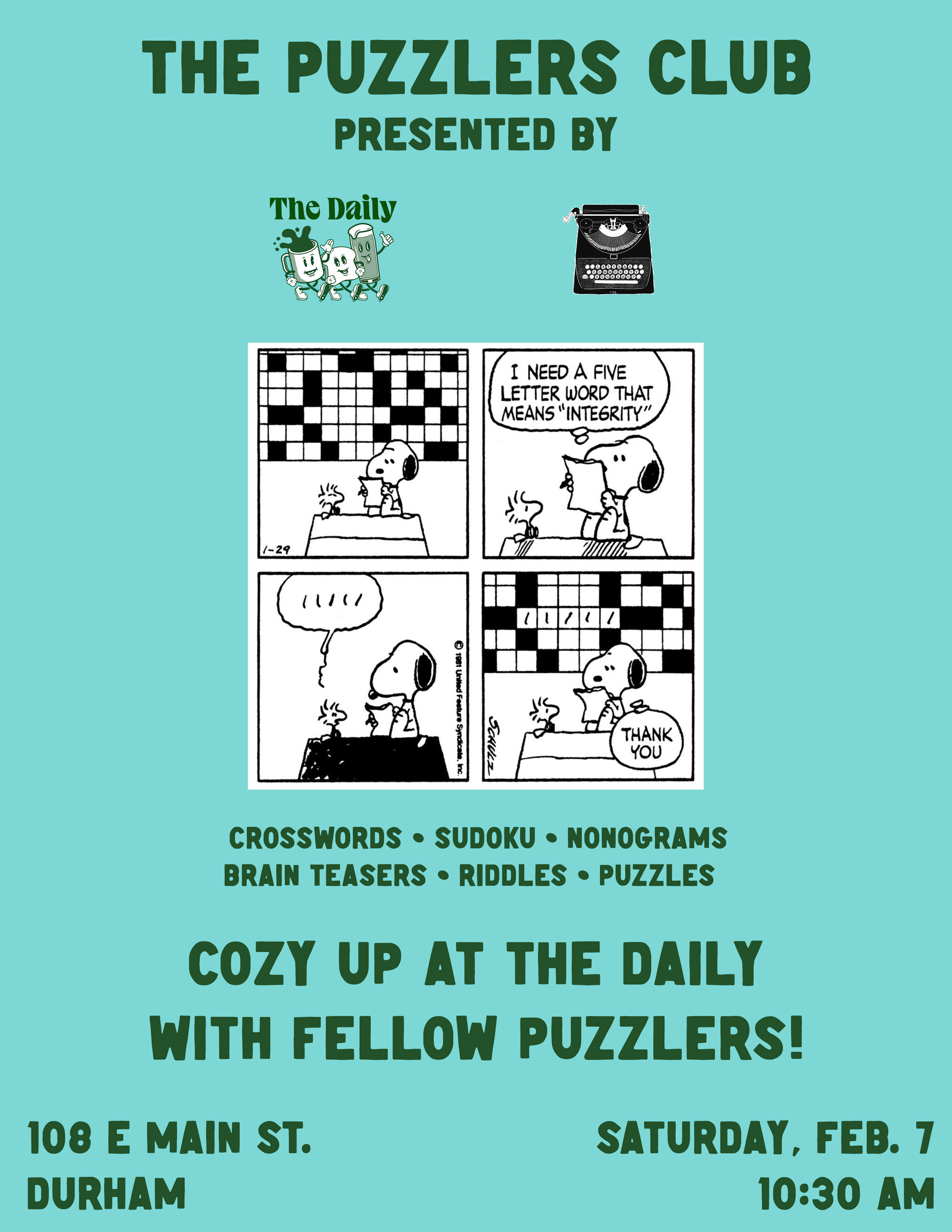 Join us for a casual and cozy morning of crossword, sudoku, puzzles, and more at The Daily! Our neighbors at Letters Bookshop will have some puzzle books for sale and will have a free stack of old copies of the Indy with their weekly crosswords. Or, you can bring your own puzzles to solve! Enjoy a mug of coffee and work alongside fellow puzzlers.