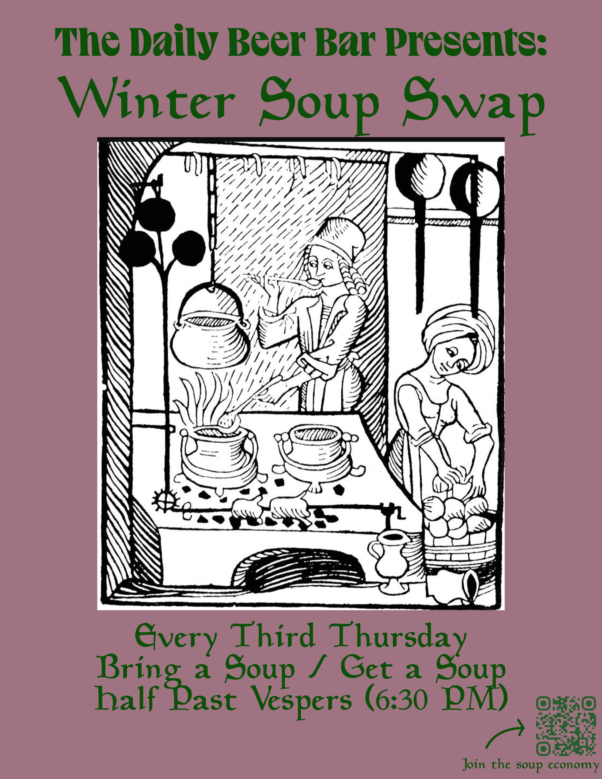 Calling all soup swappers! Come partake of the delightful soups of our friends & regulars. The premise is simple - make some soup, bring some soup, trade some soup. That's it!